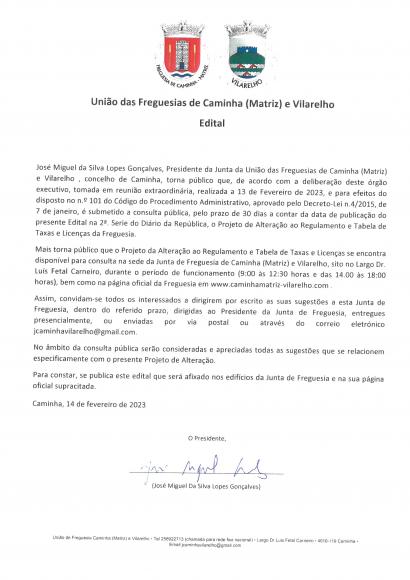 Consulta Pública de Proposta para alteração ao Regulamento e Tabela de Taxas e Licenças da Freguesia
